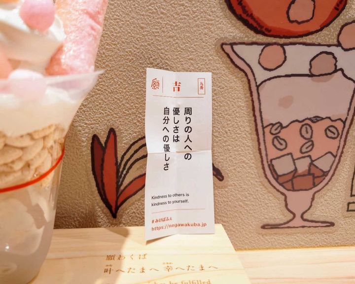 おみくじのメッセージは「晴れ時々もっと晴れ」など全30種類。お店にはおみくじを結ぶ場所はないので、財布に入れたり自宅の目に付くところに飾ってみるのがいいかも。「#みけぱふぇ」を付けてSNSで発信すれば、みんなでおみくじの言葉を共有して楽しめます。