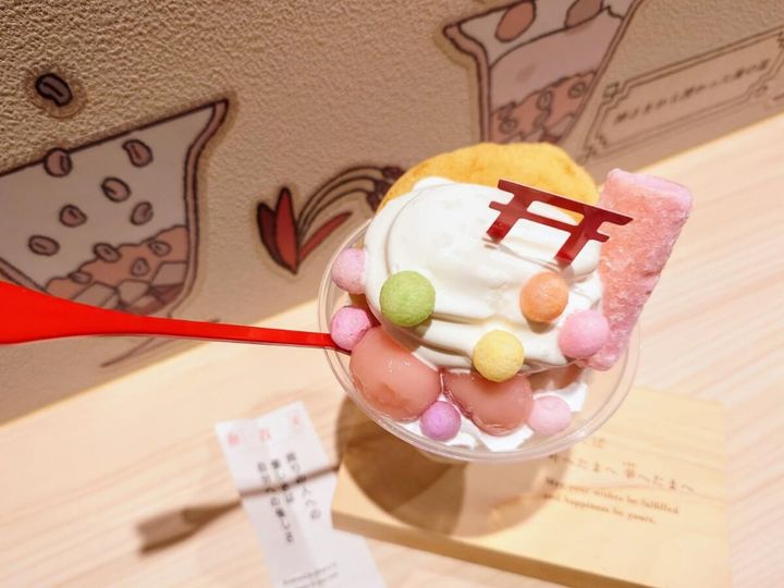 こちらは「御饌パフェ(ミルク餡)」。いちばん上に鳥居が飾られたてんこ盛りの可愛らしいパフェです。
