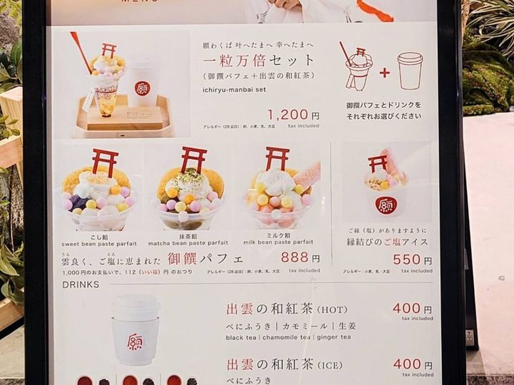 パフェの他にも、「縁結びのご塩(えん)アイス」(税込550円)、「出雲の和紅茶(べびふうき・カモミール・生姜)」(全税込400円)、パフェとドリンクのセット「一粒万倍セット」 (税込1,200円)とあります。