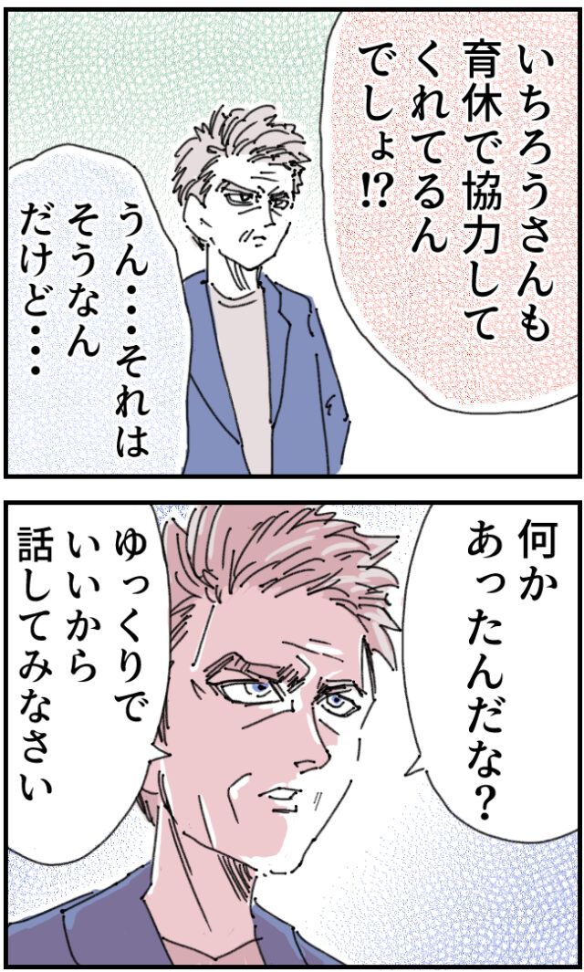 「いちろうさんも育休で協力してくれてるんでしょ!?」いちろうさんが育休を取得していることを知っているお母さんは、その状況でかおりさんが倒れるほど無理をしなければならなかったことに疑問を感じます。「うん・・・それはそうなんだけど・・・」と話しにくそうなかおりさんを見て、「何かあったんだな?ゆっくりでいいから話してみなさい」と静かにお父さんが言いました。