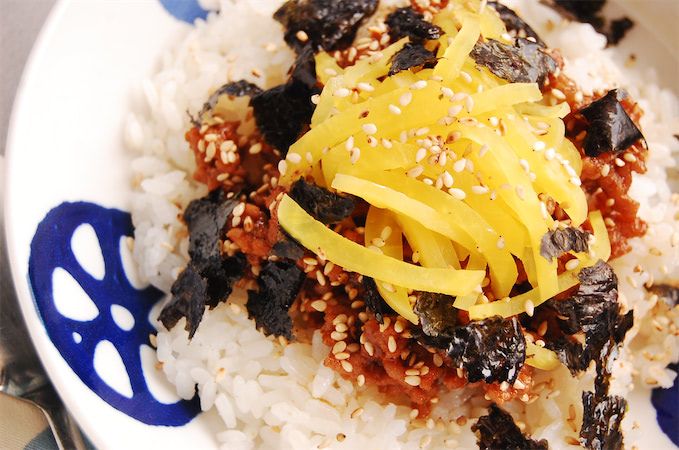 ピリッとした辛味がほんのり効いた、甘くてこってり味の肉みそ。そして、ポリポリした食感のたくあんに、香ばしい白ゴマとゴマ油。さらに、のりの風味が見事に混ざり合い、キンパ風の味を構築しています。ご飯が進む味です。