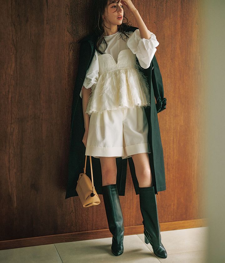 フェザーキャミ¥37,400(ウィム ガゼット/ウィム ガゼット 青山店)ブラウス¥16,940(ネイヴ/オンワード樫山)コート¥48,400(アダム エ ロペ)ハーフパンツ¥17,600(アルページュストーリー)バッグ¥55,000(ミウール/ショールーム セッション)ブーツ¥99,000(ネブローニ/マルティニーク ルミネ横浜)ピアス¥44,000(ブランイリス/ブランイリス トーキョー)