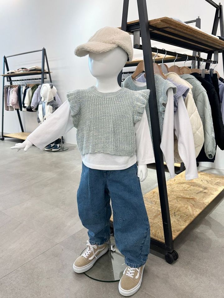 ざっくりとした畦編みのフリルニットベストがポイントのコーディネート。トップスは、シンプルなカットソーがセットになったお得感のあるアイテム。パンツは、メンズやウィメンズでも大ヒットしているバレルレックジーンズ。バレル=樽のような曲線を描くワイドシルエットが最旬! 裾が絞られていることで、外遊び中やお手洗いの際にも裾をひきずる心配なしのキッズ服として優秀なシルエット。