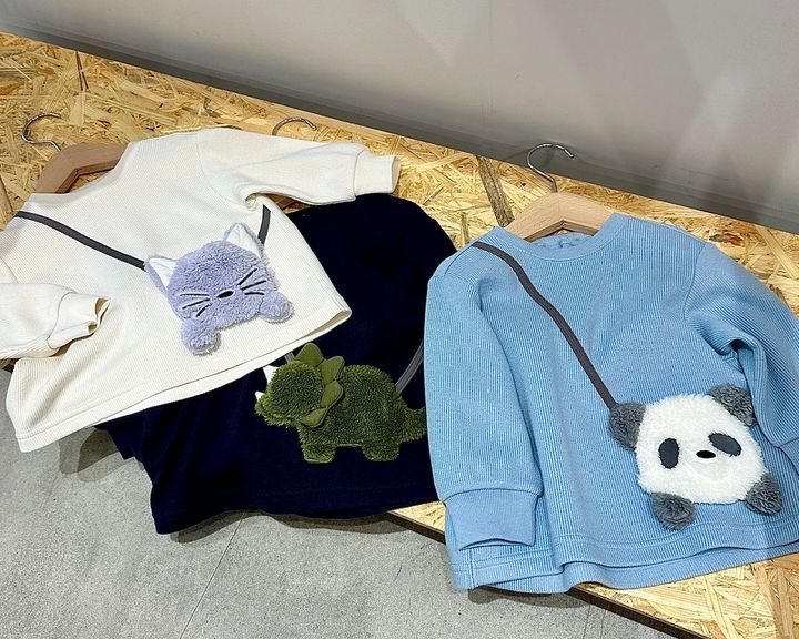 中に着ていたのは、ポシェットを下げているようなデザインの今季一押しのカットソー! こちらもパンダと恐竜とネコの3種類。ベビーのトップスは、パパとママたちの声から開発した「カンタントップス」と呼ばれる、スナップボタンなしで子どもが自分でも着替えやすく、親も着替えさせやすい作り。