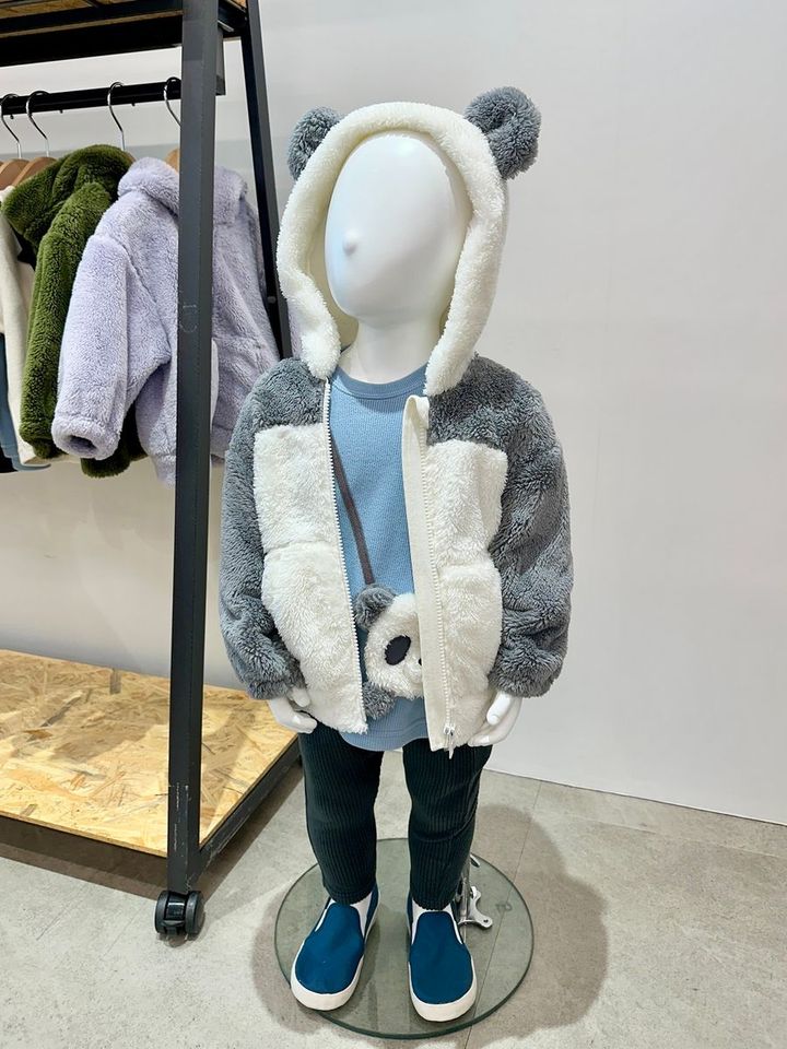 「かわいい~!」と思わず口に出してしまう耳付きのフリースアウター。バリエーションは、パンダと恐竜とネコの3種類。ベビーが好きなモチーフを選んであげれば、好んで着てくれるはず。インナーに着ているカットソーとお揃いにするのもおすすめ。
