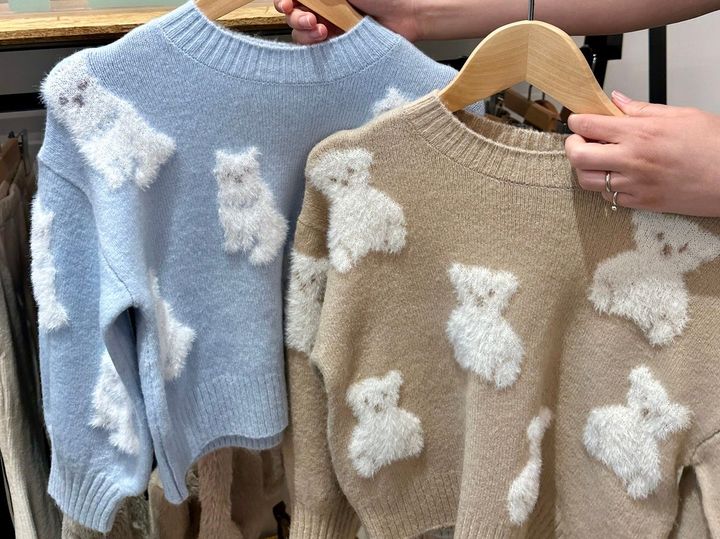 フワっと立体的なネコとクマの柄がかわいいニットは、柔らかな肌触りのパフィタッチ。少しだけボリュームのある袖もポイント。