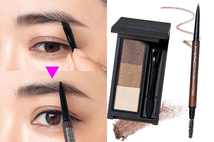 左・ほのかにカーキが入った抜け感眉に。セルヴォーク インディケイト アイブロウパウダー 09 ¥3,850(セルヴォーク)右・極細ラインで1本1本描き足せる。プロ ブロウ ディファイナー 1MM-チップ ペンシル ブルネット¥3,630(M・A・C)