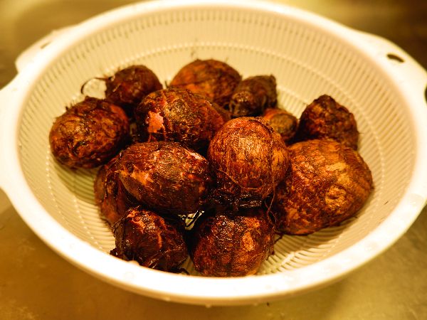 1.サトイモの皮を剥いて、塩揉みし、軽く茹でてザルにあげて洗い、ぬめりを取ります。