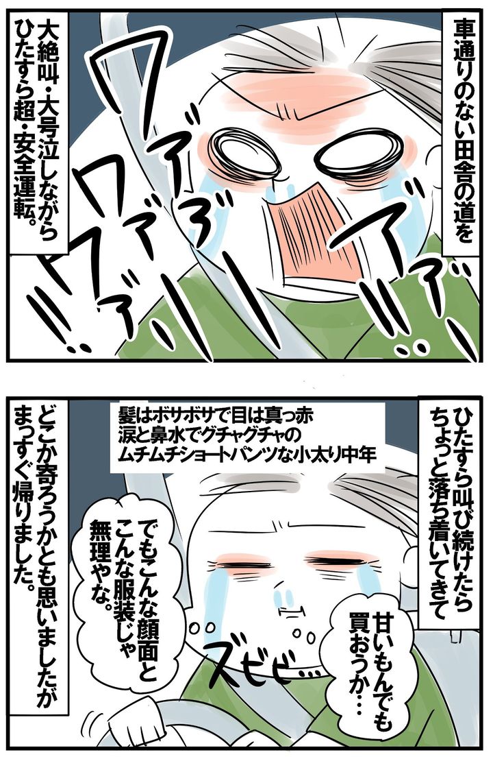 でももうこの時は押しころす余裕がなかったので、免許証の入った財布だけ持って車に飛び乗り、ゆっくりと自宅駐車場から出ながら大絶叫の大号泣!