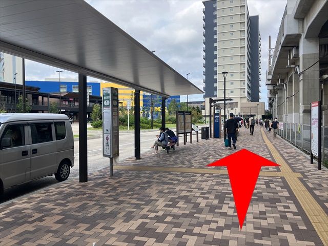 ららポート南館前のバスターミナルに到着したら、施設内を通ってららアリーナ方面の大きな道を目指します。