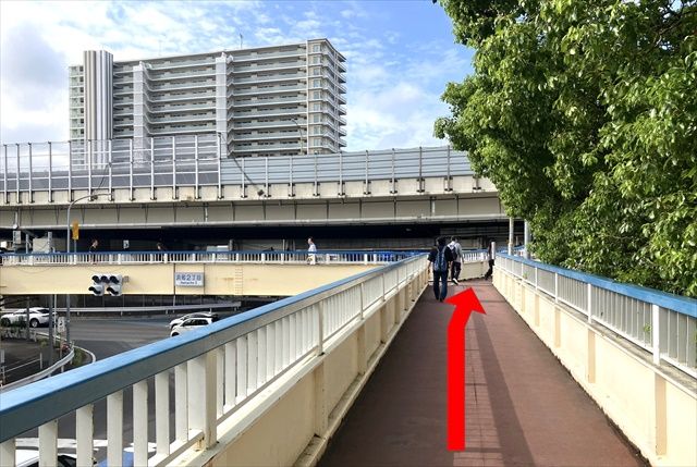 大きな歩道橋の分岐を右へ進みましょう。歩道橋を利用しないと対岸へは渡れないので要注意!