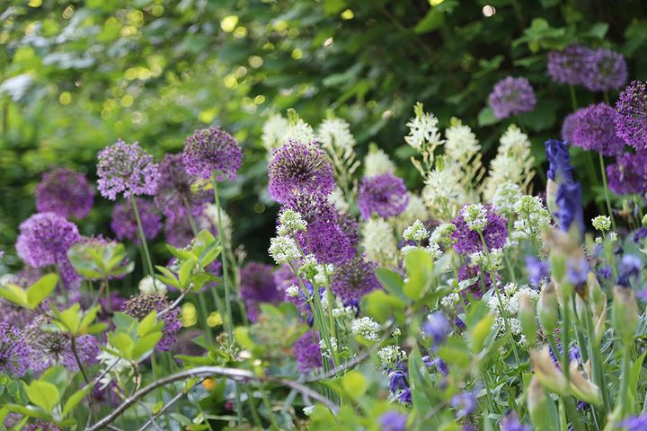 長い花茎を伸ばし、高さ1.5mまで成長するアリウム・ギガンチウムは、花壇の主役となる存在。濃い紫色の散形花序は生き生きとしていて、近くから観察しても面白いですよ。すっと伸びた茎の先に大輪の丸い花を咲かせる様子は、長く尾を引きながらのぼる打ち上げ花火のようです。アリウムの代表的な種であるアリウム・ギガンチウムは春に花が咲き、秋に植えどきを迎える球根ですが、アリウムにはさまざまな種類があり、夏咲きのタイプもあります。個人的には、小型のアリウムが好みです。