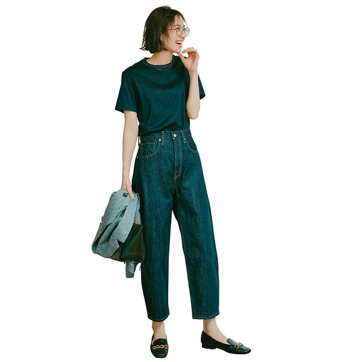 デニムパンツ¥26,400(リーバイス®/リーバイ・ストラウス ジャパン)Tシャツ¥9,680(SLOANE/ザショップ スローン 新静岡セノバ店)手に持ったジャケット¥28,600(ストラ)メガネ¥66,000(AHLEM/グローブスペックス エージェント)ピアス¥22,000(ブランイリス/ブランイリス トーキョー)ネックレス¥90,200(マリハ)バッグ¥198,000(ザンケッティ/エリオポール代官山)ローファー¥20,900(オデット エ オディール/オデット エ オディール 新宿店)