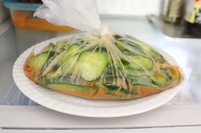 レシピ通り、冷蔵庫で3時間漬けたところ、きゅうりが茶色っぽくなり、調味液が浸透しているのがわかりますね。