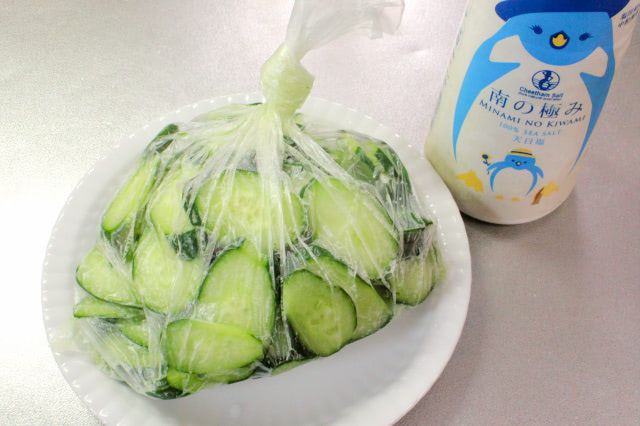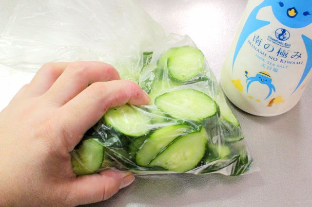 2. ポリ袋にきゅうりと塩を入れ、袋の上からよく揉みます。空気を抜いて15分ほど置いておきます。