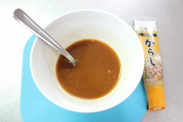 しょうゆ、酢、辛子を加えて混ぜると、濁ったような色に。辛子が溶けるように、しっかりと混ぜてくださいね。