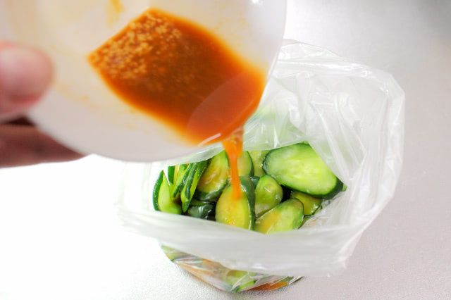5. 新しいポリ袋に水気を切ったきゅうりと3を入れ、空気を抜いて口を閉じます。それを、冷蔵庫で3時間以上漬けましょう。