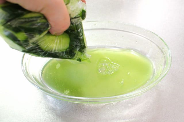 4. 2の袋の角を少し切り、袋の上からしっかりと絞って、水分を出します。