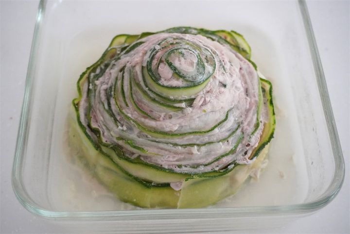 不揃いなズッキーニのスライスも上手く重ねれば問題なし。好みの大きさになったら耐熱容器に移します。