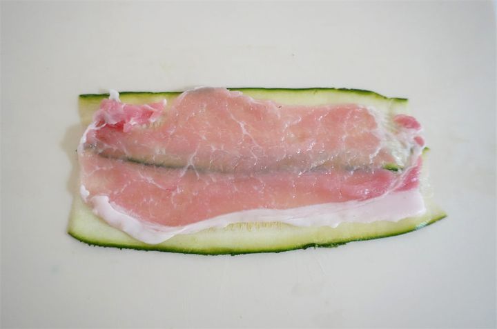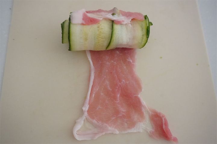 ズッキーニと豚肉を交互にぐるぐると...ひたすら巻いていきます。