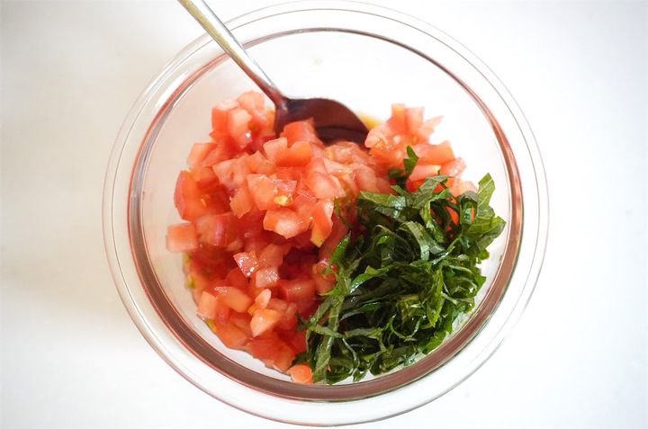 1.青じそは千切り、トマトは5mm角に切ってボウルに入れ、しょうゆとほめられ酢を加えて混ぜる。