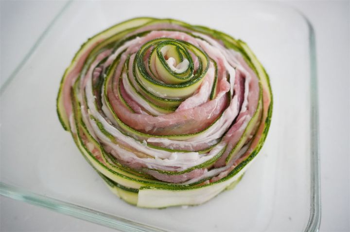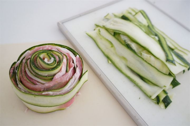 3.ズッキーニと豚肉を交互に重ねながら巻いて、形を作っていく。