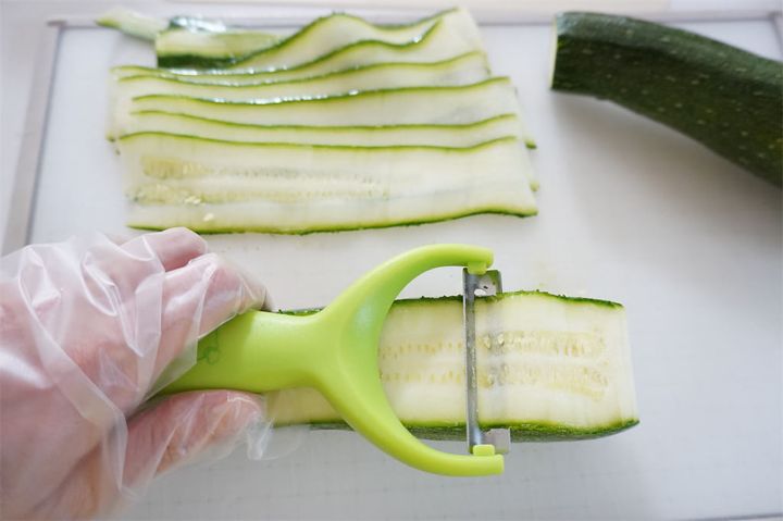 2.ズッキーニの両端を切り落としてピーラーで薄くスライスする。