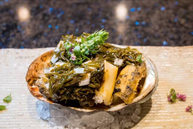 ▲「蝦夷アワビの炭火焼き 駿河湾産アカモクと長ネギ 鰹節和え添え」