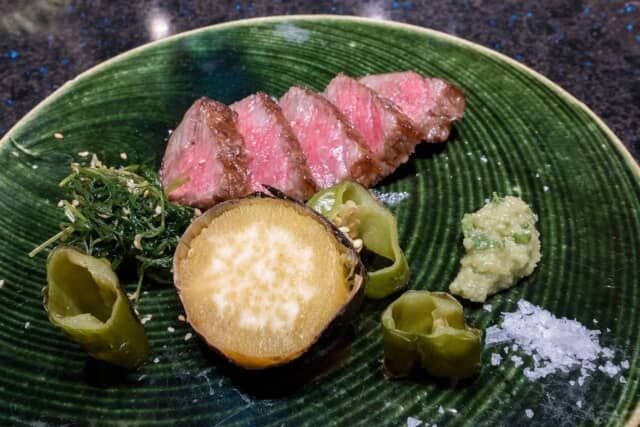 ふたつのコースメニュー「OMIKA」と「OYAMA」の、それぞれのメインディッシュを紹介します。「OMIKA」は和牛と季節の野菜の炭火焼で、プラス¥4,400で静岡和牛フィレに替えられます。和牛は日によって産地が変わり、この日は静岡県産の和牛のサーロインでした。肉の脂や旨味が口に広がり、御殿場のワサビと塩麹を合わせたソースや塩でさっぱりといただきました。