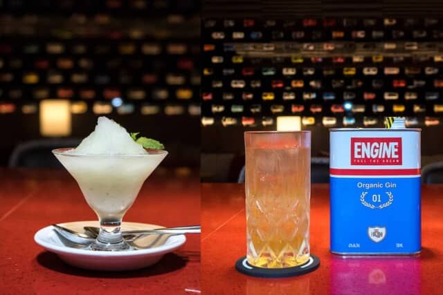 左は夏季限定の「柚子ジェラートモヒート」。ホワイトラムをベースに柚子の香りや苦みもしっかり感じられ、スプーンですくってスイーツのように楽しめます。右のカクテルは「ブースト」。ターボやスーパーチャージャーに送り込む空気圧を示す用語で、オイル缶風のボトル「エンジンオーガニックジン」やレース活動をスポンサードする「レッドブル」を使います。名前は過激ですがとても飲みやすかったです。
