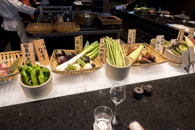 静岡県は東西に長く、富士山周辺の高原地帯から海に囲まれた伊豆半島まで南北120km弱もあるため、海と山の幸に加え、標高差や寒暖の違いもあって多彩な野菜がそろいます。カウンターに並ぶ旬の野菜が目を楽しませてくれると同時に、料理が進むにつれてその美味しさに感激。肉や魚ももちろんですが、野菜の美味しさを実感するひと時でした。