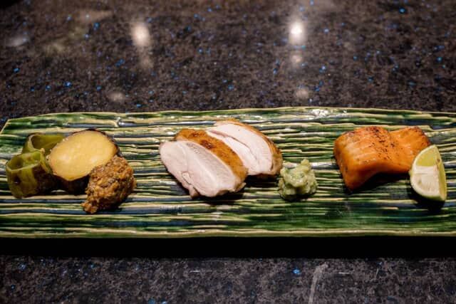 一方の「OYAMA」のメインディッシュは「お任せ焼き物」。炭火で焼いた鶏モモ肉には、ワサビと塩麹を合わせたソースの優しい辛味が加わります。静岡県産の桜咲鱒(サクラサキマス)は脂がのっていて、醤油やみりんのタレに漬け込んだ柚庵焼き。季節の野菜は甘長唐辛子やサツマイモの輪切りで、青唐辛子を使った辛子味噌が添えられます。
