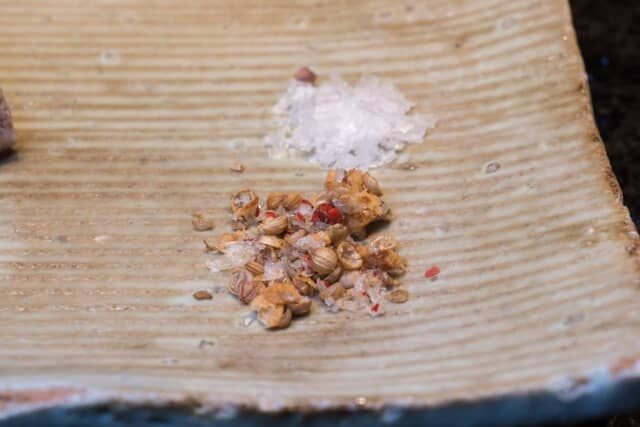 ▲鰹のタタキにつけるオリジナルスパイスとマルドンの塩