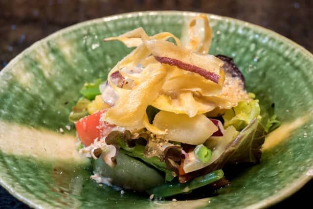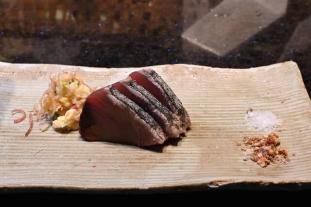 鰹の漁獲量日本一を誇る静岡県。この日は御前崎に水揚げされた鰹に、備長炭を直接押し付けて、香ばしく焦がした風味が食欲を刺激するタタキです。付け合わせのポテトサラダには鰹の酒盗などが使われ、お酒のアテにもピッタリ。さらに鰹をスパイスで食べるのは珍しく、鰹本来の味も楽しめる新しい体験でした。