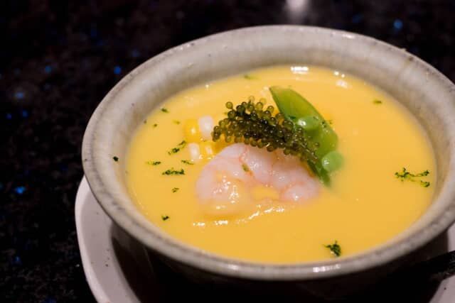 ▲「サカグチヤ豆腐の冷製茶わん蒸し 海ぶどう 海老 とうもろこしの擦り流し」