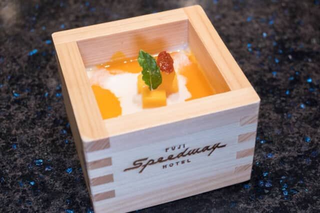 デザートはホテル特製の枡に入ったマンゴープリン。スピード感たっぷりのホテルロゴと和心いっぱいの枡がいい雰囲気。鮮やかな果肉がトッピングされ、ココナッツミルクがかかります。とても滑らかな舌触りと控えめな甘さで、マンゴーの味が引き立っていました。