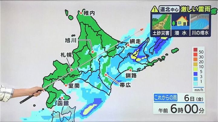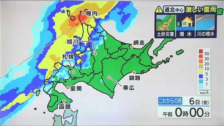 雨雲の動きは速く、あす6日朝には広く雨がやみますが、道北を中心に大雨になるおそれがあります。土砂災害や低い土地の浸水、河川の増水に注意してください。