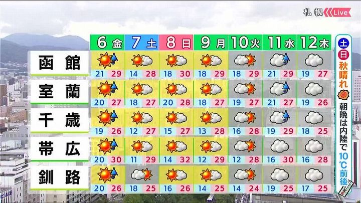 火曜日にかけて晴れて、行楽や農作業にも良い日和が続きます。帯広では日曜日は32度など、残暑は厳しいため、熱中症対策をしてください。