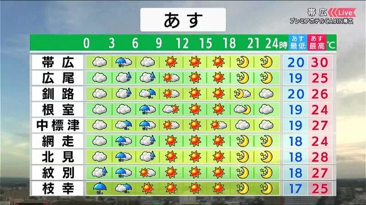 通勤通学は根室方面を中心に雨が降りますが、昼頃から晴れる見込みです。帯広は30度の真夏日で、残暑が厳しいでしょう。