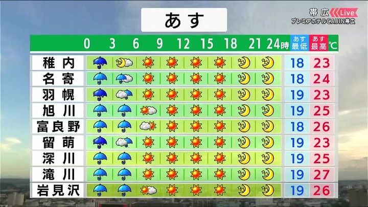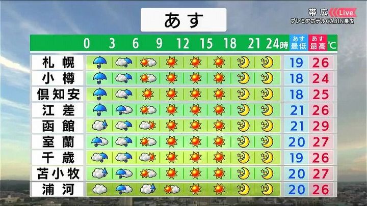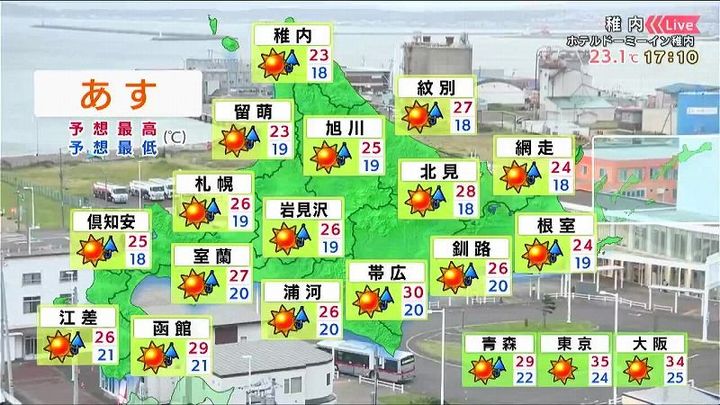 札幌や函館、苫小牧など朝には晴れるでしょう。広く25度以上の夏日になりますが、カラッとした空気で風が心地よく感じられそうです。