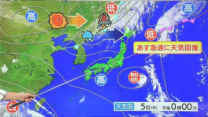 5日夜から大雨をもたらす雲の原因は、北海道の西にのびる前線です。前線の通過に伴って激しい雷雨のおそれがあります。その雲の後ろは高気圧。晴れのエリア、太陽が控えています。