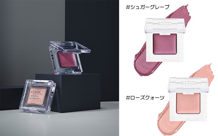 ETVOS「ミネラルアイバーム」各2,750円(税込) 上:クールなアイメイクや引き締めカラーにも使える「シュガーグレープ」 下:肌色年齢問わず使えるほんのり艶ピンクのベーシックカラー「ローズクオーツ」
