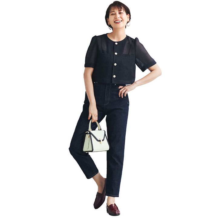 カーディガンジャケット¥6,589(ロペピクニック)中に着たバンドゥ¥13,200(アンクレイヴ ホワイト/アンクレイヴ)デニム¥26,400(ヤヌーク/カイタックインターナショナル)イヤリング¥29,700(ブランイリス/ブランイリス トーキョー)バッグ[ショルダーストラップ付き]¥605,000(ヴァレクストラ/ヴァレスストラ ジャパン)シューズ¥29,700(ダイアナ/ダイアナ 銀座本店)