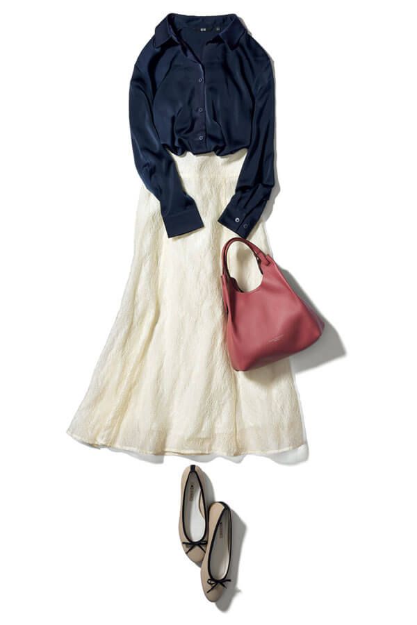 シャツ¥2,990/UNIQLO スカート¥13,970/WILLSELECTION(WILLSELECTION ルミネエスト新宿店) バッグ¥59,400/ジャンニ キアリーニ(ジャンニ キアリーニ 銀座店) シューズ¥15,400/ダイアナ(ダイアナ 銀座本店)