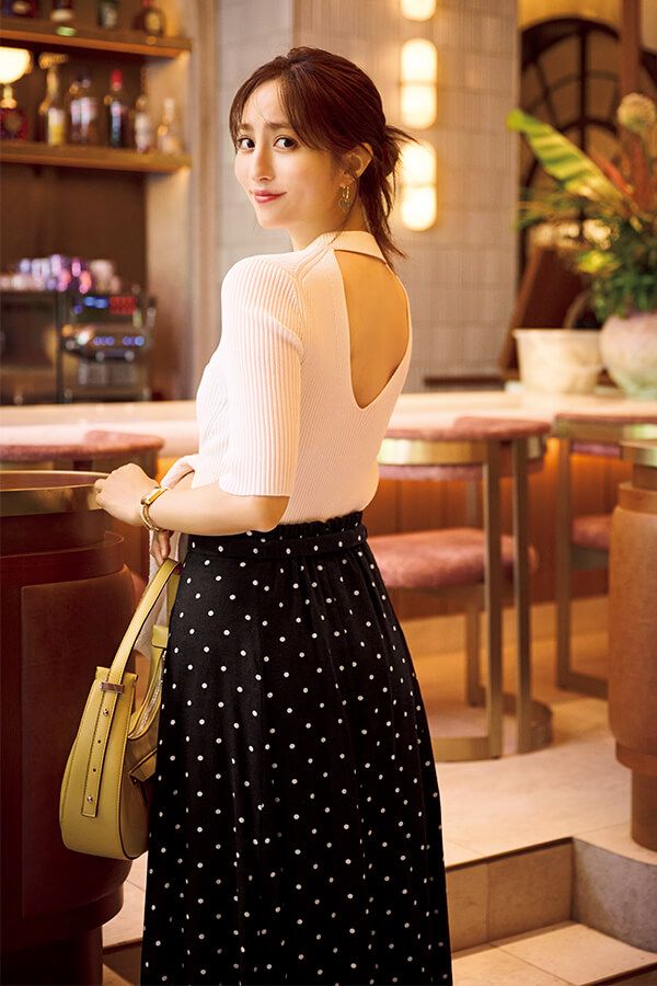 仕事終わりにバーへ。フィット感のあるコンパクトなシルエットのニットは、フレアスカートと好相性。正面は上品、後ろはセクシーのギャップで視線をさらって。
