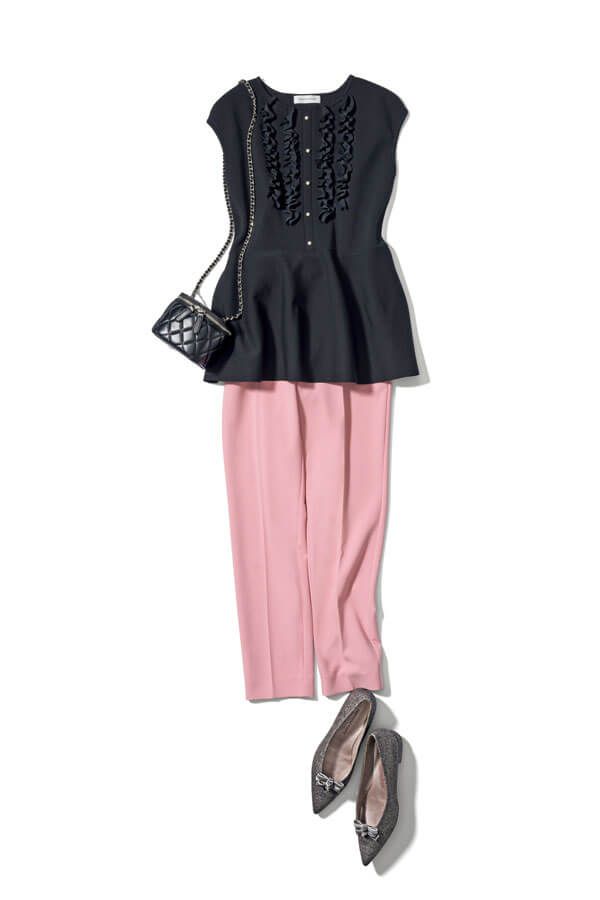 ピンクパンツは、黒でキリッと引き締めることで大人レディな印象へ。ペプラムトップスでお尻をカバーしつつ、テーパードパンツで美脚をメイクして♡