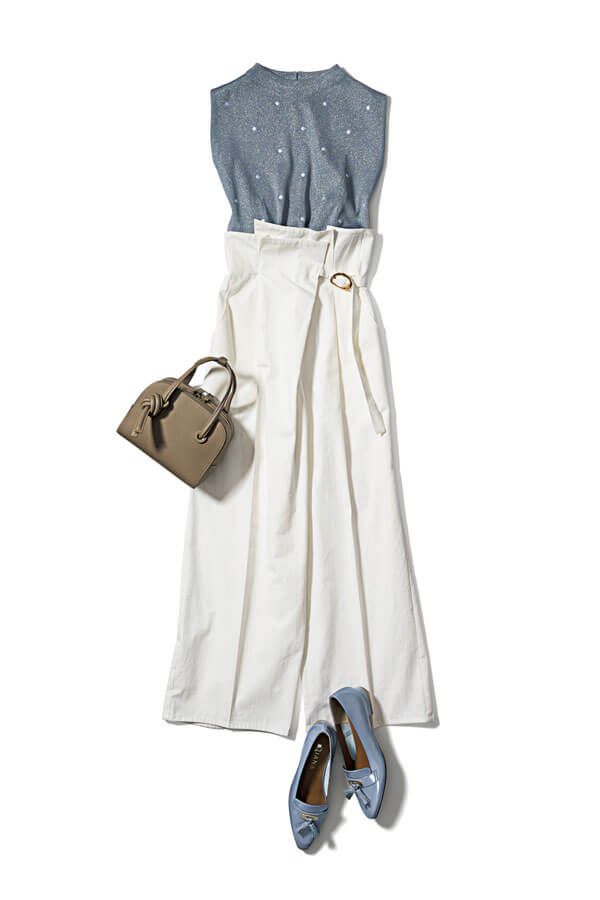全方位的に好印象なブルーは、白との相性抜群! トップスに色を持ってくることで、白がより際立ちエレガントな雰囲気にクラスアップ。