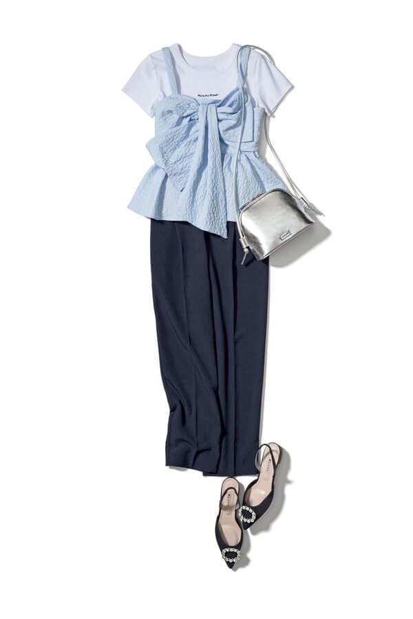 今季トレンドのキャミトップスでパンツコーデを刷新。 胸元のリボンデザインがフェミニン感をプラス♡