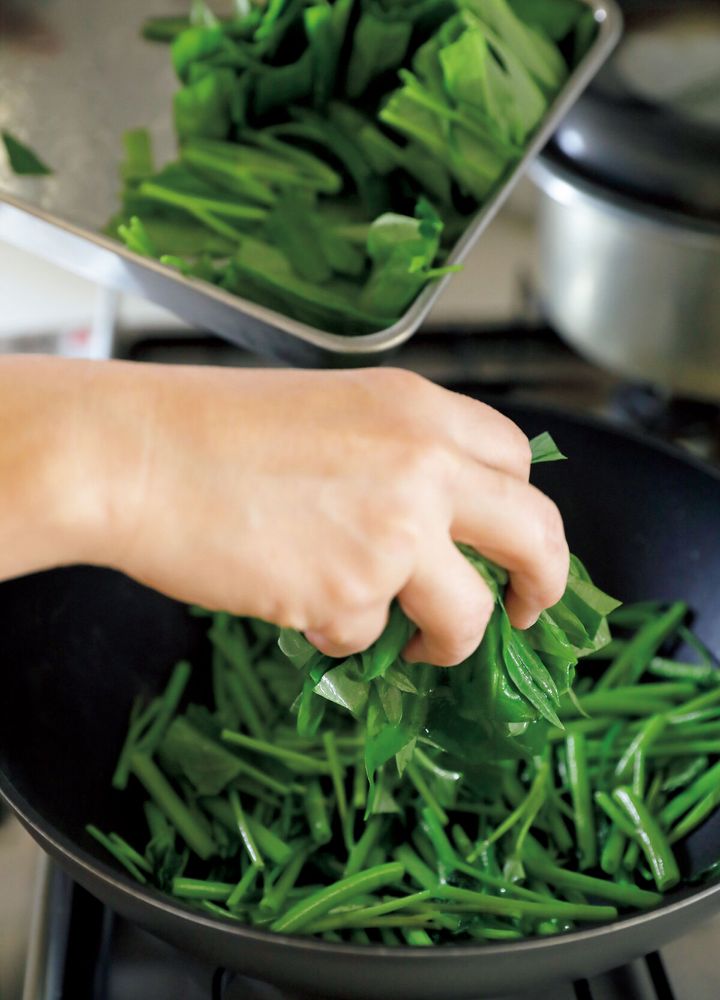 茎から炒め、充分に火が通ったところで葉を加え、すばやく仕上げます。