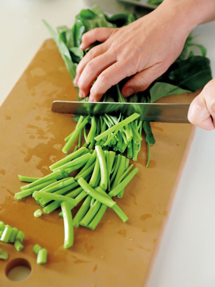 茎がやや堅く、葉はすぐに火が通るので、切り分けて時間差で加熱すると上手に火が通ります。